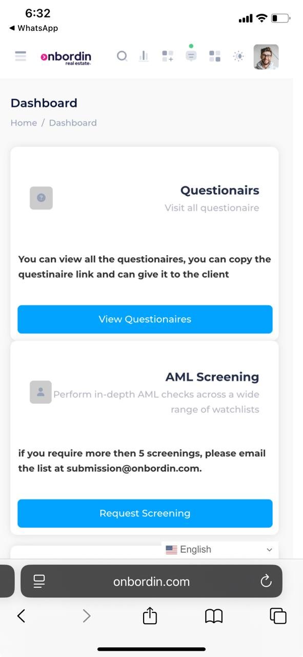 Also in the dashboard you will see the questionaire link.using which you can browse the questionaires , can fill up the questioniare and submit, can request for aml screening and can update/edit your profile